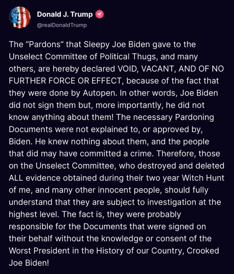 Trump is punching Democrats back harder and faster than he did 8 years ago because in 2017 he got plenty of bad advice from veteran Republican lawmakers. He’s now quicker than an Elon Musk spaceship rescuing abandoned astronauts. Early this morning, Trump declared the pardons for the House J6 Committee null and void because Biden did not read or sign them—an autopen did.