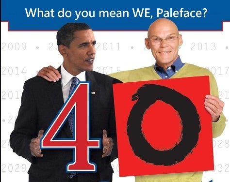 I thought it odd that James Carville illustrated the cover of his book 40 More Years: How the Democrats Will Rule the Next Generation with a poorly photoshopped picture of him and Obama. Excuse me, but Carville had been part of the Wait Your Turn, Boy primary campaign of Hillary in 2008. But what could Obama do about such blaxploitation? Cry?