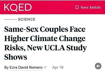 A weekend link by Instapundit revived an NPR story from two years ago, “Same-Sex Couples Face Higher Climate Change Risks, New UCLA Study Shows.”