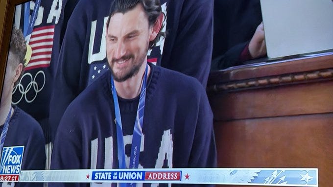 Trump said: “The men’s gold medal Olympic hockey team, come on in. [Audience chants “USA”] Go ahead. That’s the first time I’ve ever seen [Democrats] get up. [Laughter] And actually, not all of them did get up. But [the team] beat a fantastic Canadian team in overtime, as everybody saw—as did the American women who will soon be coming to the White House.”