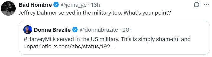 Andrea Widburg tweeted, “The Matrix is breaking down. The reality program has run amok, and what we've long believed to be reality is being shattered. Whether it's the Trump-Musk bromance break-up or National Review celebrating Harvey Milk, nothing seems real. I hear Twilight Zone music.”