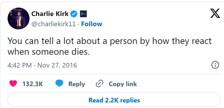 I did NOT agree with Charlie Kirk’s views on MANY important topics. I know he helped get Trump elected and people hate him for that. But he was a conservative Christian. What do you expect a conservative Christian to believe? How can those views surprise you? He argued those views calmly, reasonably, and considerately as far as I’ve seen.