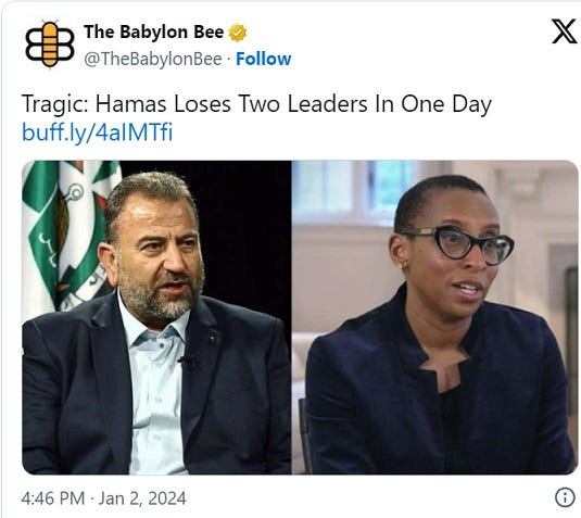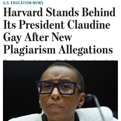 Her resignation letter, which I hope she did not plagiarize, ended, “As we welcome a new year and a new semester, I hope we can all look forward to brighter days. Sad as I am to be sending this message, my hopes for Harvard remain undimmed. When my brief presidency is remembered, I hope it will be seen as a moment of reawakening to the importance of striving to find our common humanity—and of not allowing rancor and vituperation to undermine the vital process of education. I trust we will all find ways, in this time of intense challenge and controversy, to recommit ourselves to the excellence, the openness, and the independence that are crucial to what our university stands for—and to our capacity to serve the world.”