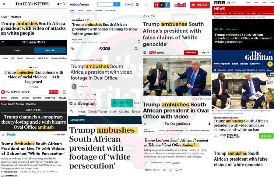 The media denial was across the board. NYT said, “The clash in the Oval Office centered on Mr. Trump’s insistence on false claims of land seizures and mass killings of white Afrikaners, members of a white ethnic minority group who ruled during the country’s apartheid era.”