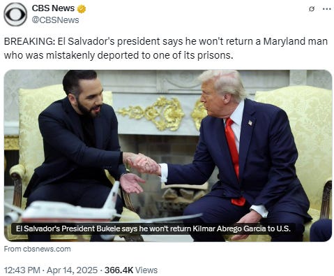 To its credit, Rupert Murdoch’s WSJ said in an editorial, “Now that Mr. Abrego Garcia is in El Salvador, the U.S. can’t simply order that foreign government to send him back. This requires diplomacy, which is a foreign-policy function reserved for the executive. Getting those wheels in motion can’t happen literally overnight as Judge Xinis commanded.”