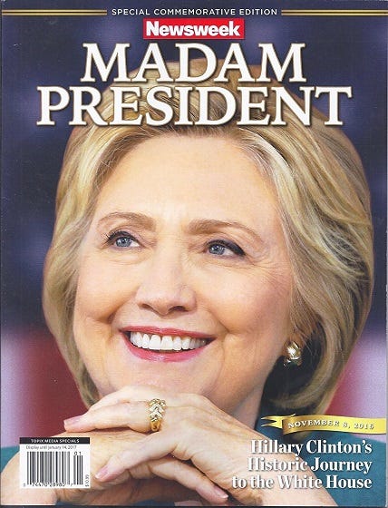 The polls said this. On Election Day, voters said otherwise, much to the chagrin of the media. The Telegraph reported, “Newsweek recalls 125,000 copies of its souvenir Madam President issue.”