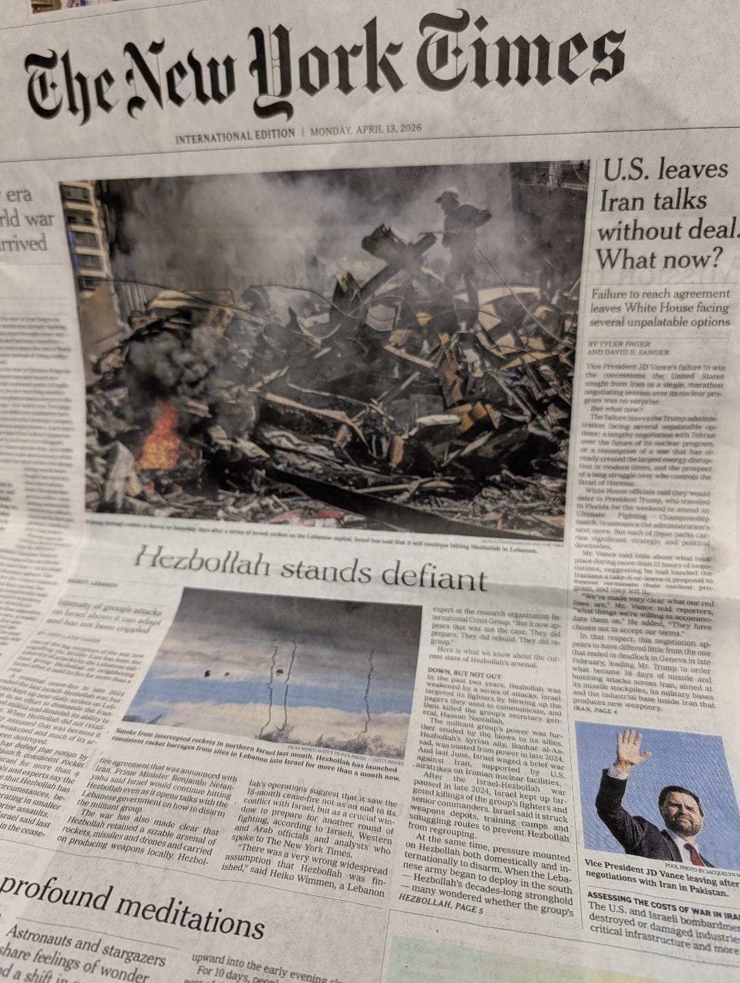 On Saturday, the New York Times front page showcased the headline: “Hezbollah stands defiant,” beneath a photo of a smoldering pile of rubble. Those plucky Iranian fanatics are invincible. They are not going to allow any stinking barrage of missiles deter them even as their leaders fall like rain in a typhoon.