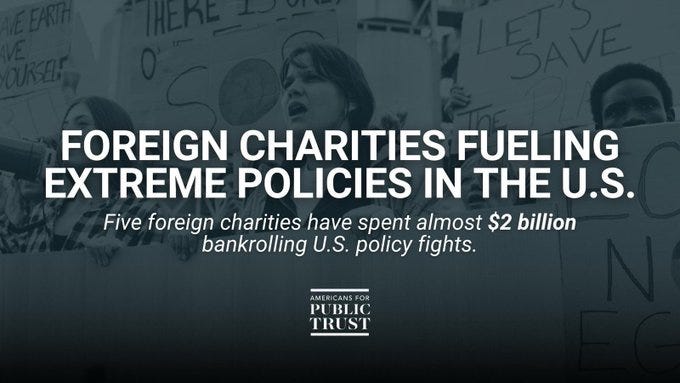 Fox News reported, “A new report revealed that five foreign charities have donated just shy of $2 billion into various American nonprofits and policy advocacy groups focused on climate change and political activism.