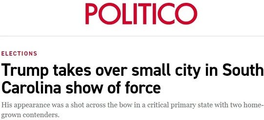“Taking over the movie-set-like Main Street of a town of 3,300 in the hills of South Carolina on Saturday, Trump put on a show of force not only in his stronghold of rural America, but in an early primary state where he remains dominant.”
