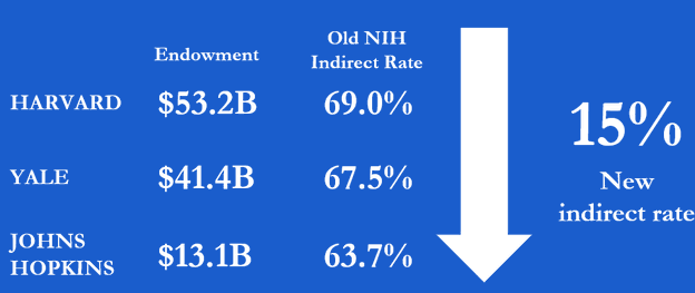 By the way, that 15% cap will hit Harvard, Yale and Johns Hopkins hardest because their administrators eat the first two-thirds of the NIH grant money, according to the Jeff Bezos Post.